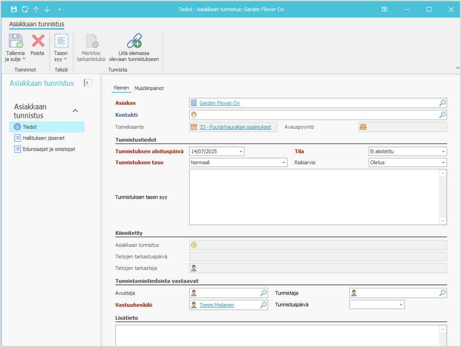 Jos tunnistustapahtuma on luotu toimeksiantoa avatessa, Asiakas- ja Toimeksianto-kentät on valmiiksi täytetty. Tunnistuksen aloituspäivä on toimeksiannon luontipäivä, tilana "ei aloitettu" ja tunnistuksen taso oletuksena "normaali".