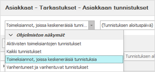 - Toimeksiannot, joissa keskeneräisiä tunnistuksia listaa ne toimeksiannot, joissa on toimenpiteitä vaativia keskeneräisiä tunnistustapahtumia.
