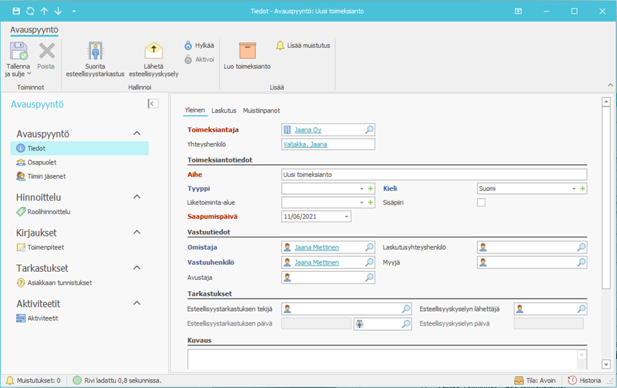 - Täydennä avauspyyntöön vähintään punaisella merkityt pakolliset tiedot: toimeksiantaja, aihe ja saapumispäivä (oletuksena kuluva päivä).