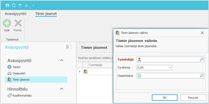 - Tiimin jäsenelle voit lisätä myös kyseisessä toimeksiannossa käytettävän tuntihinnan. Se tallentuu käyttäjän kyseiseen toimeksiantoon kirjaamille toimenpiteille, mikäli käyttäjäkohtainen hinnoittelumalli on käytössä eikä toimeksiantoon ole määritetty yleistä tuntihintaa.
