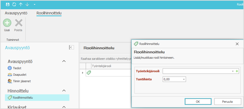 - Roolihinnoittely-kansio mahdollistaa toimeksiannon toimenpiteiden hinnoittelun käyttäjän työntekijäroolin perusteella. Voit lisätä kansiossa toimeksiantokohtaisia tuntihintoja ohjelmistoon määritetyille työntekijärooleille. Jos käytössä on roolipohjainen hinnoittelumalli eikä toimeksiantoon ole määritetty yleistä tuntihintaa, toimeksiantoon syötetyt toimenpiteet saavat tuntihinnan automaattisesti toimenpiteen tallentaneen käyttäjän roolin perusteella.