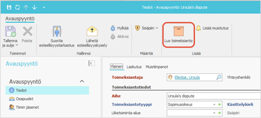 Kun avauspyyntöön on saatu kerätyksi kaikki tarvittavat tiedot eikä estettä toimeksiannon ottamiselle ole, voit konvertoida avauspyynnön toimeksiannoksi Luo toimeksianto -painikkeella. Painike löytyy yksittäisen avauspyynnön valintanauhasta ja Työtehtävät-alueen Avauspyynnöt-kansiosta.