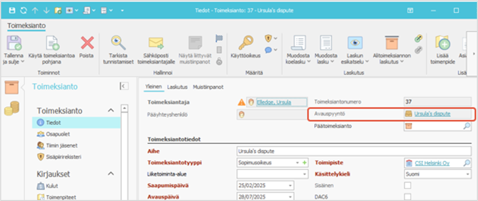 Kun luot avauspyynnöstä toimeksiannon, avauspyynnön tiedot siirtyvät toimeksiantoon aktiviteetteja lukuun ottamatta. Samalla avauspyynnön tilaksi muuttuu "suljettu", eikä siihen voi enää tehdä muutoksia. Suljettua avauspyyntöä pääset edelleen tarkastelemaan klikkaamalla toimeksiannon Avauspyyntö-kentästä löytyvää linkkiä.