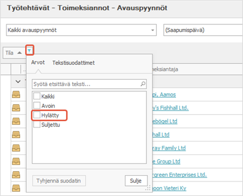 Ellei toimeksiantoa voida ottaa vastaan, voit hylätä avauspyynnön valitsemalla avauspyyntölistan tai avauspyyntöikkunan valintanauhasta Hylkää-painikkeen. Hylättyjä avauspyyntöjä voit tarkastella Kaikki avauspyynnöt -näkymässä valitsemalla avauspyynnön Tila-ryhmittelytekijässä Hylätty-vaihtoehdon.