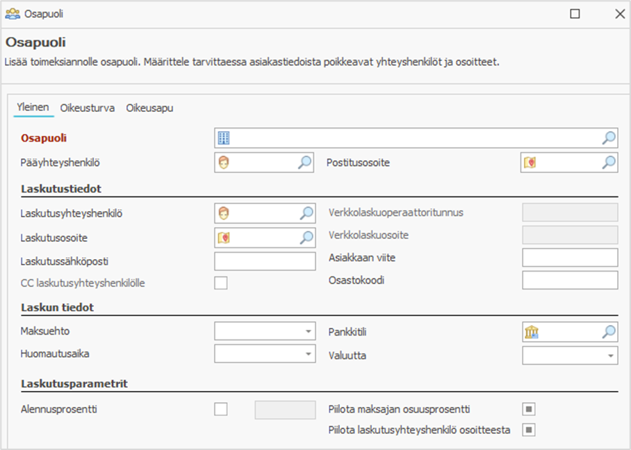 - Määritä osapuolille tarvittaessa toimeksiantokohtainen laskutusosoite tai alennusprosentti Osapuoli-ikkunassa.