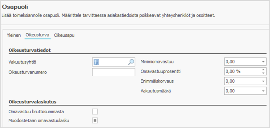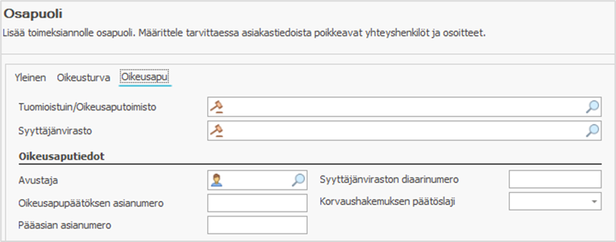 - Jos kyseessä on oikeusaputapaus, täydennä osapuolelle myös Oikeusapu-välilehden tiedot. Lue lisää täältä.