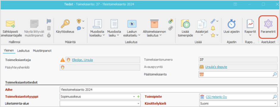 Pääkäyttäjä on tehnyt ohjelmiston asetuksissa määrityksiä, jotka vaikuttavat kaikkiin toimeksiantoihin. Nämä määritykset sekä mahdollisesti asiakastasolle tehdyt määritykset voit ylimäärittää toimeksiantokohtaisesti toimeksiantolistan ja toimeksiannon ikkunan valintanauhasta löytyvällä Parametrit-painikkeella.