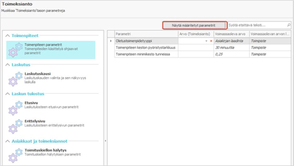Valitsemalla ”Näytä määritetyt parametrit” saat näkyviin kaikki asetuksista periytyvät tai kyseiselle toimeksiannolle jo määritetyt parametrit.