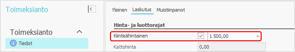 - Mene toimeksiantoikkunan Laskutus-välilehdelle ja valitse Kiinteähintainen-kenttä.