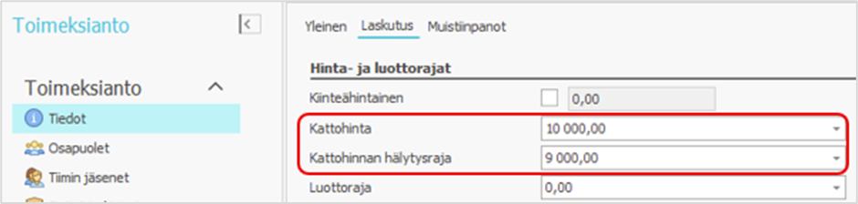 Jotta lähestyvään hintakattoon osataan reagoida ajoissa, voit asettaa Laskutus-välilehdellä myös kattohinnan hälytysrajan siten, että se on sopivasti kattohintaa alempi. Kattohinnaksi voidaan asettaa esim. 10 000 € ja hälytysrajaksi 9000 €.