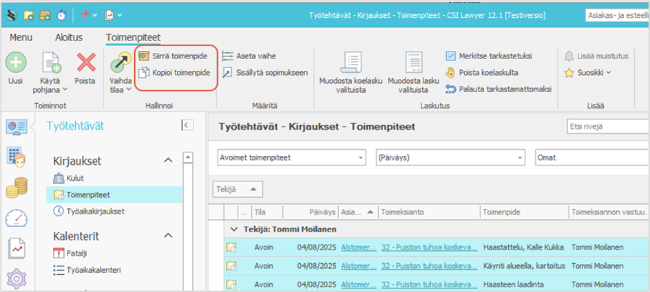- Valitse halutut toimenpiteet ja valintanauhalta Siirrä / Kopioi toimenpide.