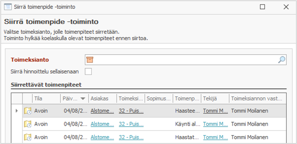 - Jos siirrettäväksi on valittu useita toimenpiteitä saman asiakkaan eri toimeksiannoista, käyttäjälle suodatetaan lista kyseisen asiakkaan toimeksiannoista.