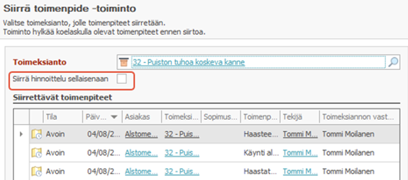 - Valitse Siirrä/Kopioi hinnoittelu sellaisenaan, jos haluat ohjelmiston säilyttävän toimenpiteiden alkuperäiset tuntihinnat riippumatta siitä, onko kohdetoimeksiannolle määritetty poikkeavia tuntihintoja.
