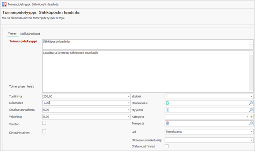 Kuhunkin toimenpidetyyppiin voidaan määrittää valmiiksi sen oletustuntihinta ja arvioitu kesto sekä lisätä Toimenpiteen teksti -kenttään toimenpiteen pidempi kuvaus. Se kopioituu uusille kirjattaville toimenpiteille luonnoksena, jota käyttäjä voi muokata tai täydentää. Valmis luonnos nopeuttaa kirjauksia ja saa myös asiakkaalle lähtevän laskun näyttämään yhtenäisemmältä.
