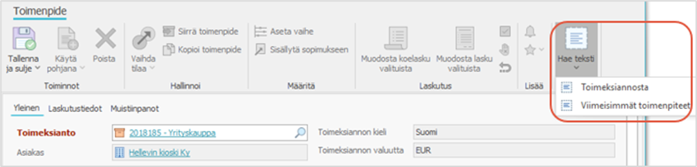 - Toimenpide-kenttään kirjoitettu toimenpiteen selite näkyy laskun erittelyssä. Jos toimenpidetyypit ovat käytössä, luonnokseksi kopioituu toimenpidetyypille määritetty kuvaus, jota voit muokata tarpeen mukaan. Valintanauhan Hae teksti -painikkeella voit kopioida toimenpiteelle selitteen tekijän samaan toimeksiantoon aiemmin kirjaamista toimenpiteistä tai tekijän kaikista viimeisen 30 päivän aikana kirjaamista toimenpiteistä. Valitun toimenpiteen selite korvaa silloin alkuperäisen. Selitteen sallittu pituus on 1000 merkkiä, ja esimerkiksi Romeo hylkää liian pitkiä toimenpidetekstejä sisältävät korvaushakemukset. Ohjelmisto tarkastaa myös kentän oikeinkirjoituksen.