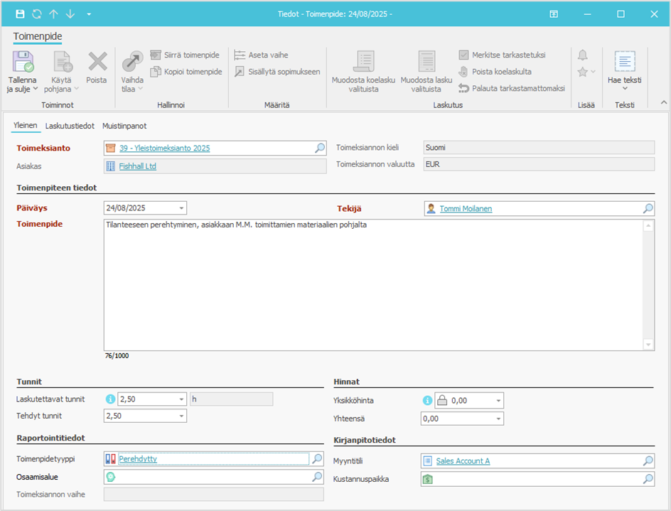 - Voit määrittää toimenpiteelle myös kirjanpidollisen myyntitilin ja kustannuspaikan. Ne kopioituvat toimenpiteelle toimeksiannon tiedoista, mutta toimenpiteen tekijän kustannuspaikka ylimäärittää toimeksiantotason kustannuspaikan. Raportointi tehdään kuitenkin usein toimeksiantotason kustannuspaikan mukaan.