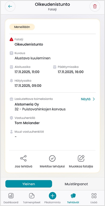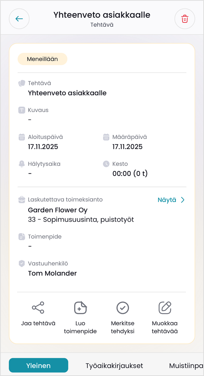 Tehtävän Yleinen-välilehti näyttää tehtävän tiedot sekä siihen mahdollisesti liittyvän toimeksiannon. Näytä-painikkeella pääset tarkastelemaan toimeksiannon tietoja.