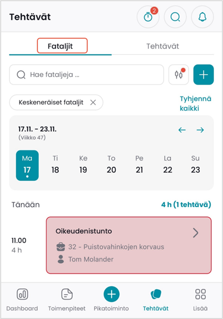 Tehtävät-näkymään siirryttäessä sovellus avaa oletuksena Fataljit-välilehden.