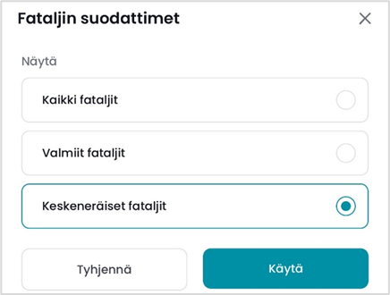 Suodattimien avulla voit tarkastella valmiiksi merkittyjä, keskeneräisiä tai kaikkia fataljeja. Kun suodatin on käytössä, suodatinikonissa näkyy punainen piste. “Tyhjennä” poistaa kaikki suodattimet.