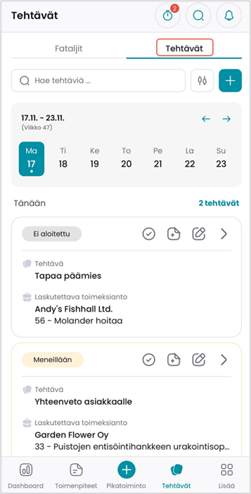 Voit tarkastella ja muokata tehtäviä sekä lisätä uusia tehtäviä avaamalla Tehtävät-välilehden.
