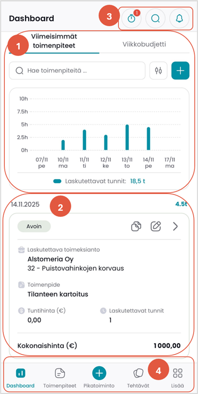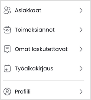 - Lisää: Valikko, josta pääset muihin sovelluksen osioihin, kuten asiakkaisiin, toimeksiantoihin, omiin laskutettaviin, työaikakirjauksiin ja profiiliin.