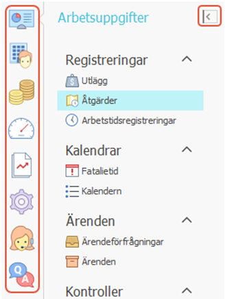 Du kan gömma mappstrukturen genom att klicka på den lilla pilen uppe till höger om mappstrukturen, eller genom att klicka en gång till på ikonen för det område som redan är öppet. Mappstrukturen blir synlig igen genom att klicka på ett av områdena.