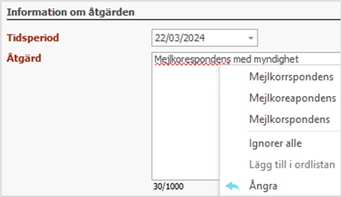 Det går att ta i bruk stavningskontroll för texter som skrivs i följande fält: ärendets ämne, beskrivning och fakturanamn, åtgärdens text och tilläggsuppgifter, utläggens och aktiviteternas ämne samt preliminärfakturans och fakturans fritext.