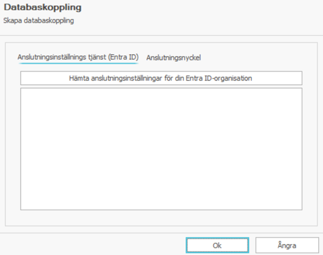 - Om ditt företag använder sig av Entra ID-autentisering, välj Anslutningsinställningstjänst (Entra ID)-fliken och klicka på “Hämta anslutningsinställningar för din Entra ID-organisation”.