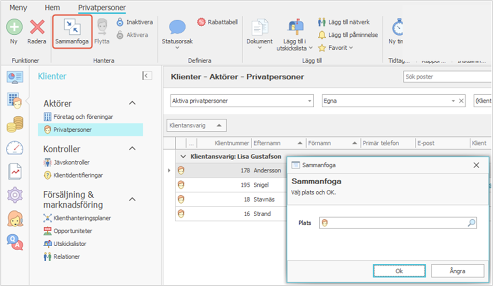 OBS! Behovet att sammanfoga klienter bör alltid övervägas noggrant eftersom sammanslagningen inte kan ångras. Om systemet är integrerat med ett dokumenthanteringssystem omfattar sammanfogandet även dokumenten som tillhör dessa klienter. Funktionen för sammanfogning är som standard tillgänglig för alla vanliga användare, men för att undvika misstag kan huvudanvändaren begränsa rättigheterna till funktionen till en viss användargrupp.
