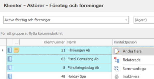 Om du är huvudanvändare eller har utökade rättigheter till systemet kan du redigera flera klienters uppgifter (t.ex. klientansvarig) samtidigt. Ändra flera-funktionen syns inte i funktionsraden, utan finns endast i menyn som öppnas genom att högerklicka på en rad.