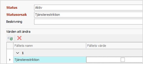 - När parametern har sparats gör valet av funktionen Statusorsak > Tjänsterestriktion att rutan för tjänsterestriktion automatiskt bockas i i klientfönstret.