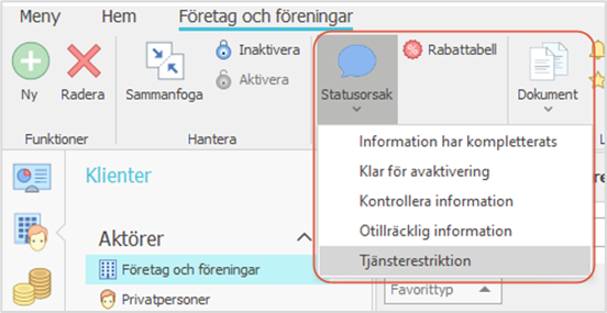När dessa inställningar har gjorts är det enkelt att välja tjänsterestriktion t.ex. för en klient genom att i funktionsraden välja Statusorsak-funktionen och Tjänsterestriktion. Avsluta tjänsterestriktion tar i sin tur bort tjänsterestriktionen. Statusen i klient- och ärendefönstrens Tjänsterestriktion-fält ändras i enlighet med den valda statusorsaken.