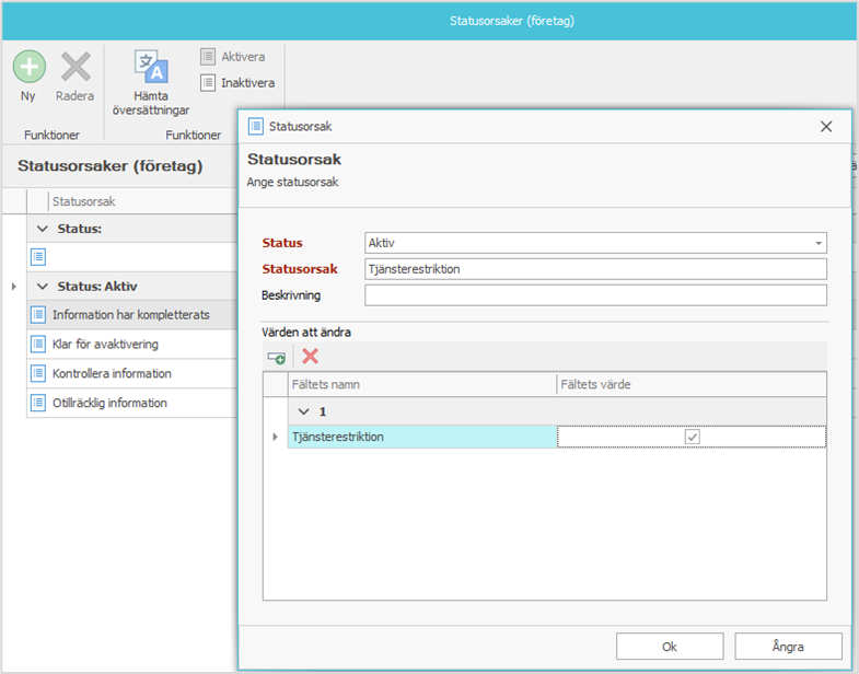 - Lägg på samma sätt till en statusorsak för ’Avsluta tjänsterestriktion’ så att du även kan ta bort tjänsterestriktionen via samma funktion i klientens funktionsrad. I detta fall lämnar du Fältets värde tomt.