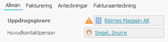 - En gul varningstriangel till vänster om fältet Uppdragsgivare indikerar att uppdragsgivaren måste identifieras.