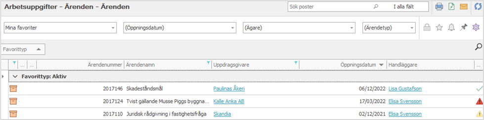 - En röd varningstriangel indikerar att klientidentifiering inte påbörjats för en eller flera parter i ärendet.