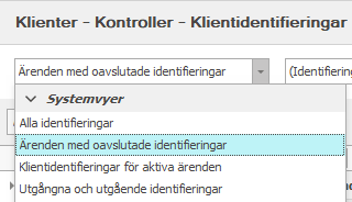 - Ärenden med oavslutade identifieringar, listar de klientidentifieringar som är länkade till ett ärende där det finns en eller fler oavslutade identifieringar.