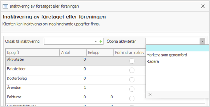 Om det inte finns förhindrande registreringar kan du ange vad som ska ske med de eventuella öppna aktiviteter som finns registrerade för klienten (markera som slutförd/radera). Därtill kan du välja en orsak till att klienten inaktiveras om huvudanvändaren definierat inaktiveringsorsaker i inställningarna.