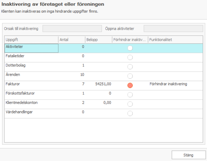 Om klienten har registreringar som förhindrar inaktiveringen erbjuder systemet endast att stänga fönstret, eftersom dessa behöver tas om hand innan en inaktivering kan göras.