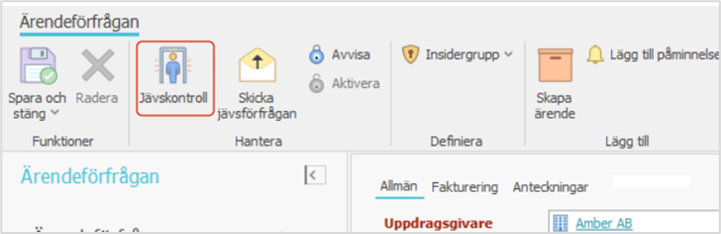 För att undvika att skapa ärenden i onödan rekommenderar vi att utföra jävskontroll och klientidentifiering av ärendets uppdragsgivare och betalare redan via ärendeförfrågan. Det går dock att skapa ett ärende av ärendeförfrågan även om dessa inte utförts, och klientidentifieringen kan utföras även på ärendet.