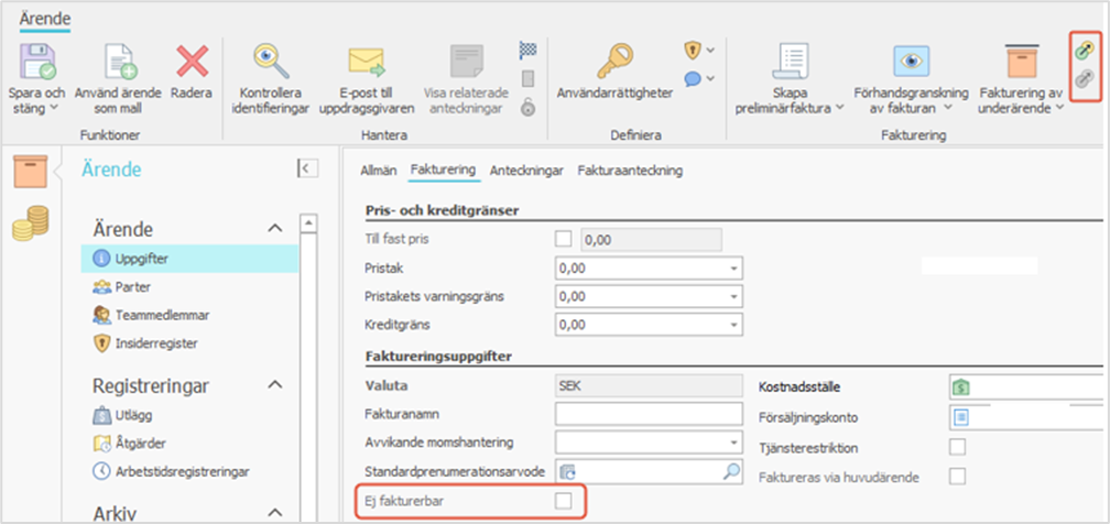 Ett normalt fakturerbart ärende kan markeras som ej fakturerbart och, vid behov, senare anges som fakturerbart igen. När ett ärende markeras som ej fakturerbart kan inga fakturor skapas, men åtgärder kan registreras på ärendet och faktureras senare om det markeras som fakturerbart igen. OBS! Denna funktion är inte tillgänglig för interna ärenden.