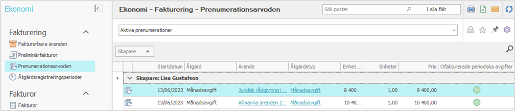 I ekonomiområdet under Prenumerationsarvoden-mappen listas alla prenumerationer. Kolumnen Ofakturerade periodiska avgifter indikerar med hjälp av en grön cirkel om det finns ofakturerade periodiska avgifter.