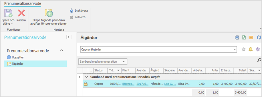 När ett prenumerationsarvode är inaktiverat blir även de fastprissatta åtgärderna kvar som öppna. De kan vid behov raderas eller markeras som ej-fakturerbara. Ett inaktiverat prenumerationsarvode kan återaktiveras via vyn ”Inaktiva prenumerationsarvoden”, på ärendenivå eller under ekonomiområdet.