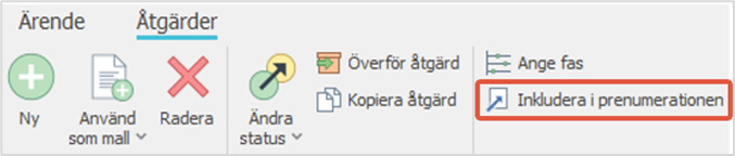 Du kan lägga till åtgärder på ett ärende med prenumerationsarvode på samma sätt som på andra ärenden. Ifall åtgärden ska tillhöra prenumerationsarvodet inkluderas den genom att välja ”Inkludera i prenumerationen”-funktionen i funktionsraden. Åtgärdens totalpris ändras då till noll och totalpriset kan inte redigeras. Om länken till prenumerationsarvodet senare raderas beräknas åtgärdens totalpris igen.