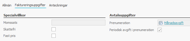 Om du vill att alla åtgärder som registreras på ärendet automatiskt ska tillhöra prenumerationsarvodet kan du i ärendets uppgifter under fliken Fakturering ange standardprenumerationsarvode.
