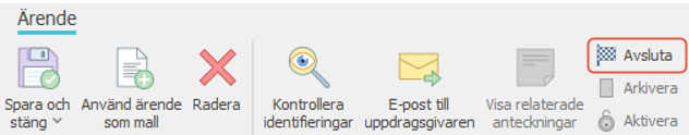 När ett ärende är färdigbehandlat, alla dess åtgärder och utlägg fakturerade och alla fakturor betalda kan du avsluta ett ärendet genom att klicka på Avsluta i funktionsraden.