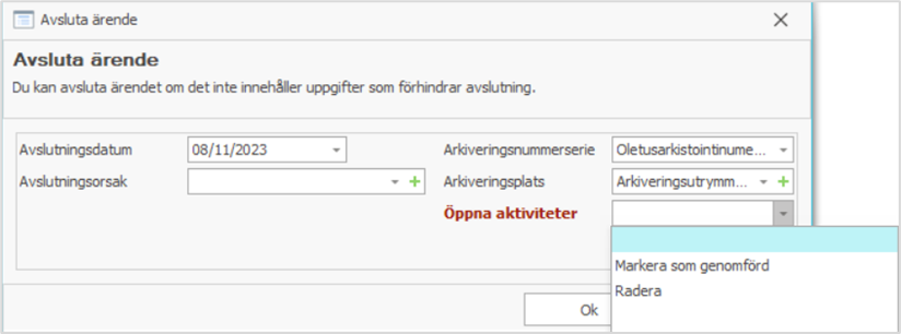 Ärenden kan massavslutas förutsatt att alla valda ärenden har samma kontorstillhörighet. Funktionsradens Avsluta-funktion öppnar ett fönster där man anger avslutningsuppgifter och väljer hur eventuella ärenderelaterade öppna aktiviteter ska hanteras. De kan antingen markeras som slutförda eller raderas.