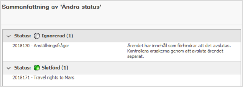 Om ett specifikt ärende inte kan avslutas som en del av massan listas ärendet i fellistan och användaren uppmanas avsluta det separat.