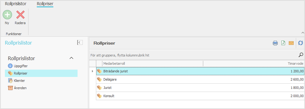 Rollprislistor gör det möjligt att skapa medaretarrollbaserade prislistor för olika klientgrupper, t.ex. inhemska, utländska och privatpersoner. Rollprislistorna gör det enklare att hantera klientspecifika rollpriser då de kan uppdateras samtidigt för alla klienter som länkats till prislistan. För att rollprislistan skall inverka på åtgärdernas prissättning måste prissättningsmodell vara antingen "Rollbaserad" eller odefinierad i parametrarna på system-, kontors-, klient- eller ärendenivå (Fakturering > Prissättning).
