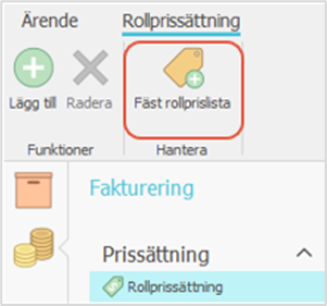 Ärenden; du kan koppla en rollprislista till ett ärende i mappen Rollprissättning via funktionen ’Fäst rollprislista’. Systemet öppnar en lista över aktiva rollprislistor vars valuta är densamma som ärendets valuta. Om du väljer en prislista raderas de tidigare definierade rollpriserna för ärendet och istället kopierar systemet in de rollpriser som hittas. Den valda rollprislistan sparas även i ärendets parametrar under Fakturering > Prissättning > Rollprislista.