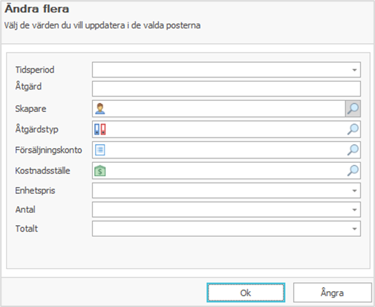 För att redigera fler åtgärder välj först de åtgärder du vill redigera (håll i Ctrl/Shift för att välja fler rader) och högerklicka sedan på en av de valda raderna. Systemet öppnar då funktionsmenyn, välj "Ändra flera" i menyn varefter nedan fönster öppnas: